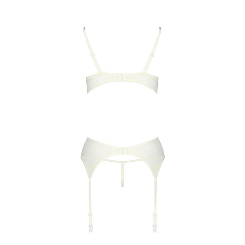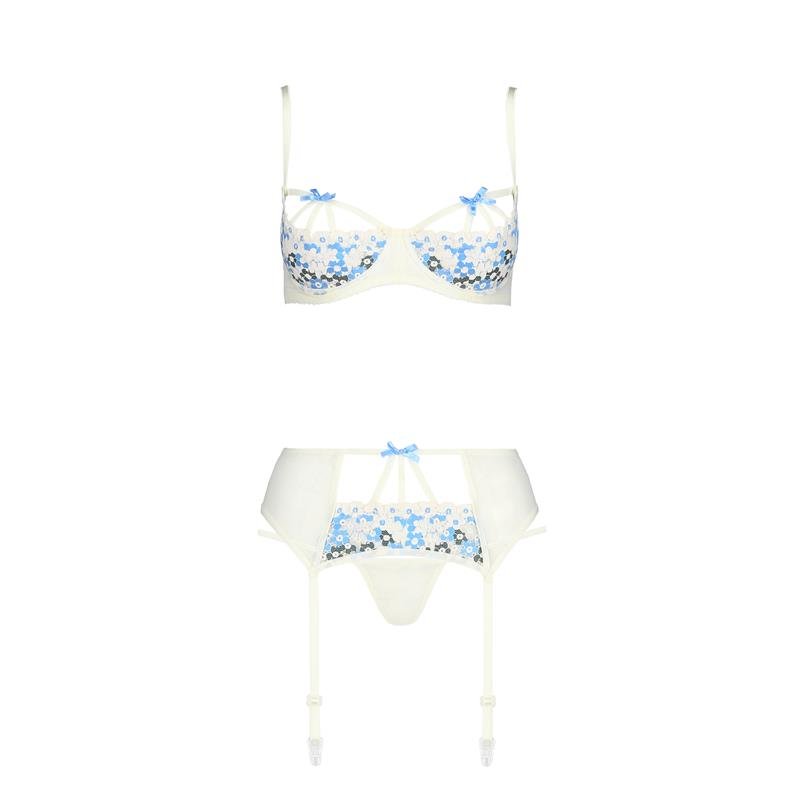 En este caso, un set muy sensual en color blanco con detalles en azul. Cuenta con unos detalles muy er?ticos, un sujetador con copas abiertas y un liguero de cadera para combinar con tus medias favoritas.?